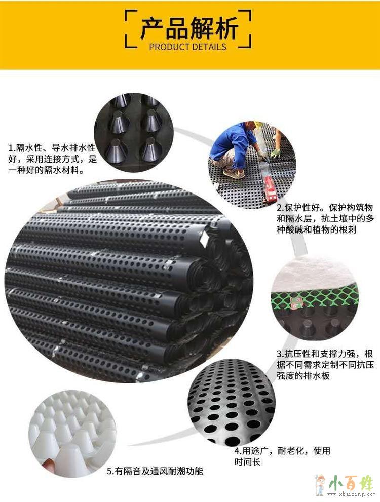6. 要做好排水板成品保护。排水板铺装后,应不容许在排水板上直接推运手推车等,运输材料时要铺设木板、马道。做到随铺随填土x.b.a.i.x.i.n.g.c.o.m。我们坚持更好的品质、更佳的产品的服务!排水板厂家全国各送货到工地,方便快捷,欢迎新老客户前来厂区参观浏览。